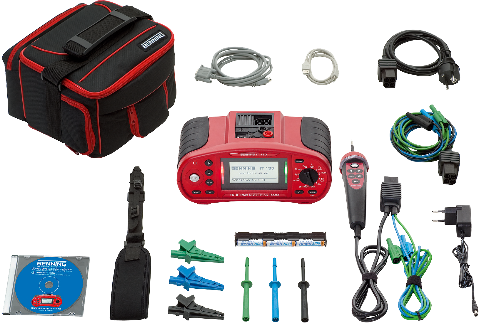 • Inclusief draagtas, draagriem, Commander-testpen, testkabels, krokodillenklemset, interfacekabels, protocolsoftware BENNING PC-WIN IT 130, 6 NiMh-accu's, laadapparaaat, gebruiksaanwijzing (CD) en kalibratiecertificaat