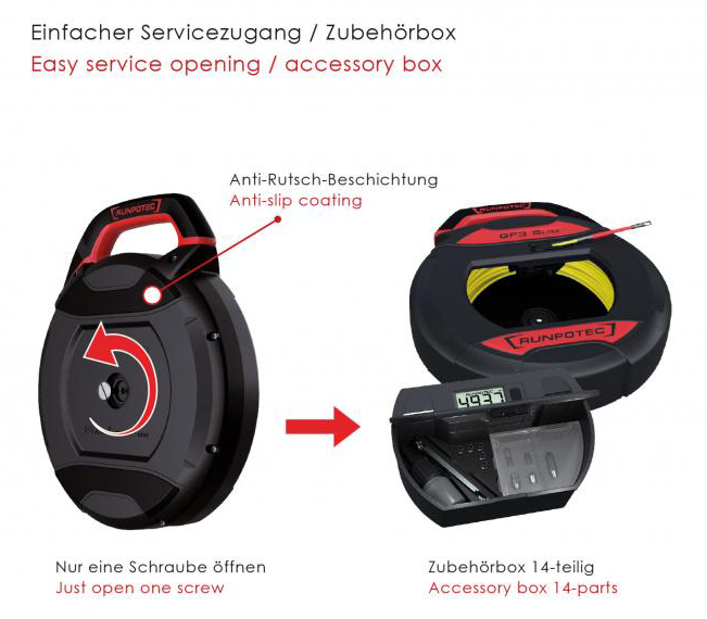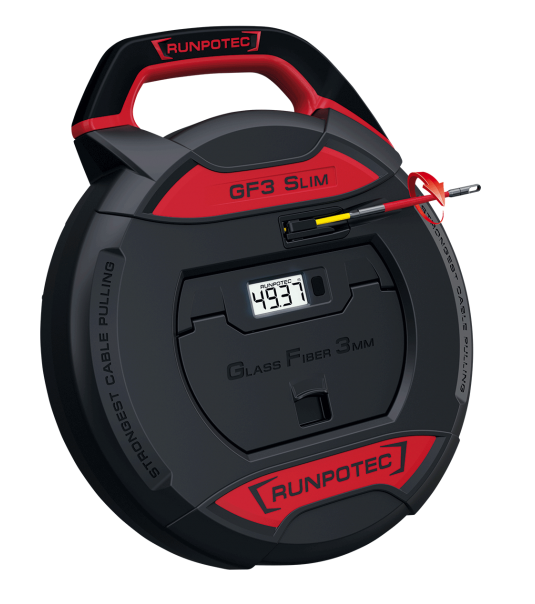 De GF3 SLIM - glasvezeltrekveer Ø 3 mm is een kabeltrekveer met meterteller. Met een maximale diameter van slechts Ø 4,5 mm is hij ideaal voor het herbedraden van bezette leidingen of het leggen van glasvezelkabels (FTTH - Fiber To The Home)