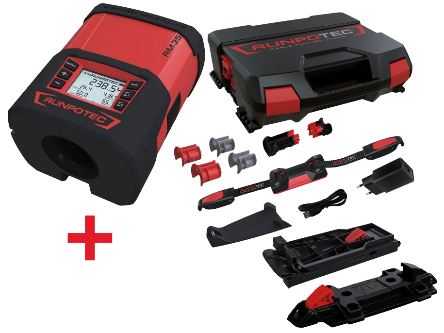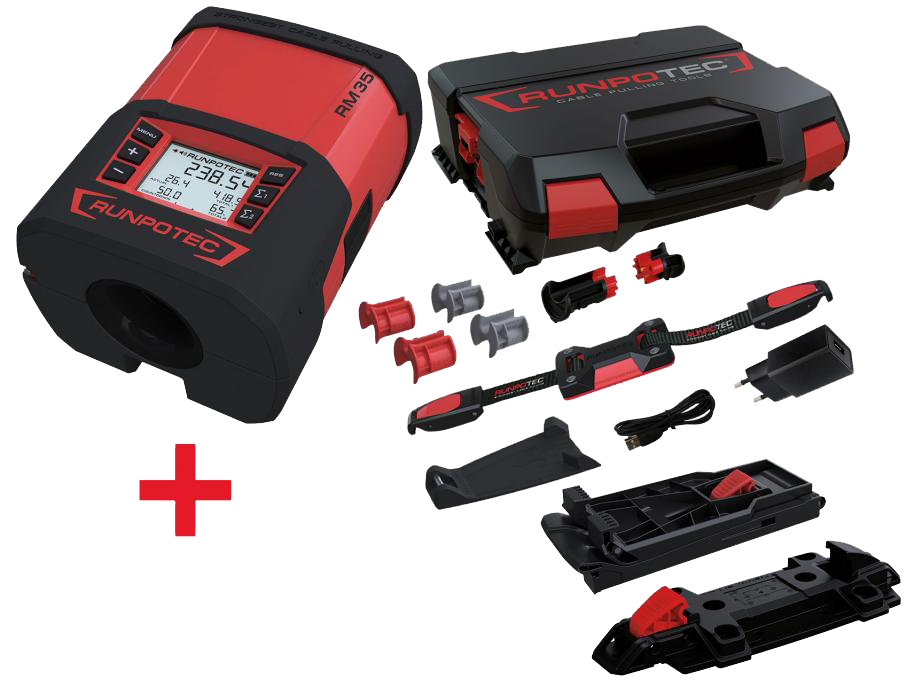 Leveringsomvang: 1 x Runpometer RM35, 1 x riem met klemsysteem 1200 mm, 1 x ankerkussen, 1 x montageplaatsysteembehuizing, 2 x geleidebekken grijs (Ø 12 mm / 18 mm), 2 x geleidebekken rood (Ø 6 mm / 24 mm), 1 x USB-C-oplaadkabel, 1 x stekker, 1 x RUNPOTEC-systeembehuizing