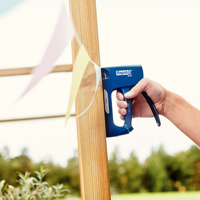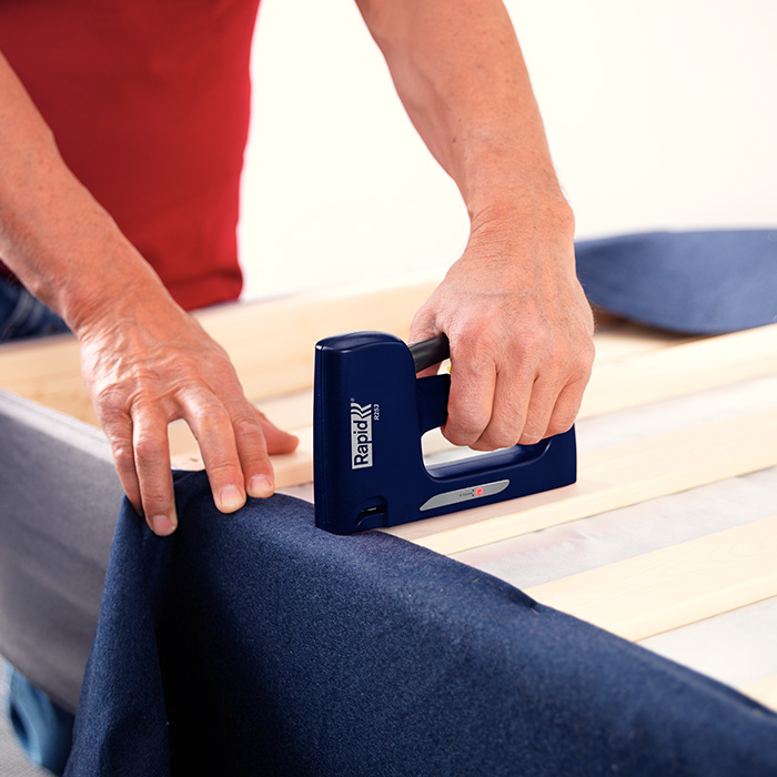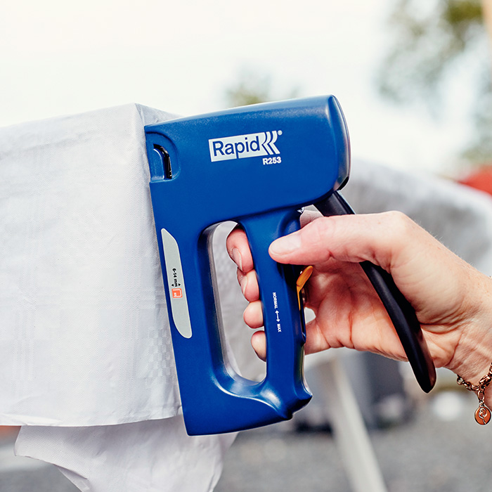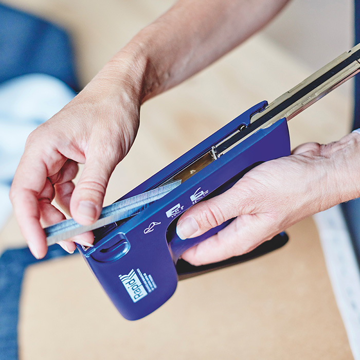 Universele tacker met inwendige slijtonderdelen van staal. Voor het bevestigen van textiel, canvas, leer, posters, netten, labels enzovoort. Hoogste stand voor lange nieten of hard materiaal.