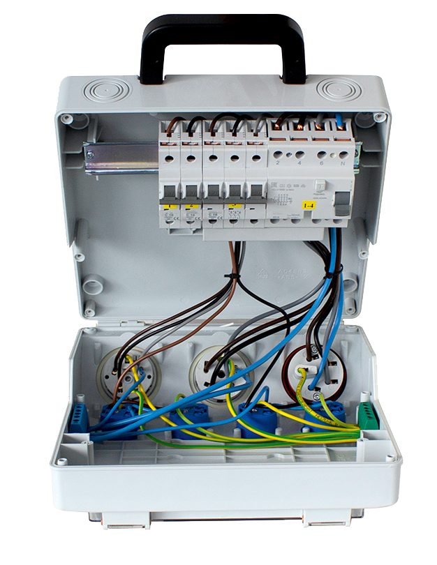 • 4x geaarde contactdoos 230 V, 16 A (over fasen verdeeld)