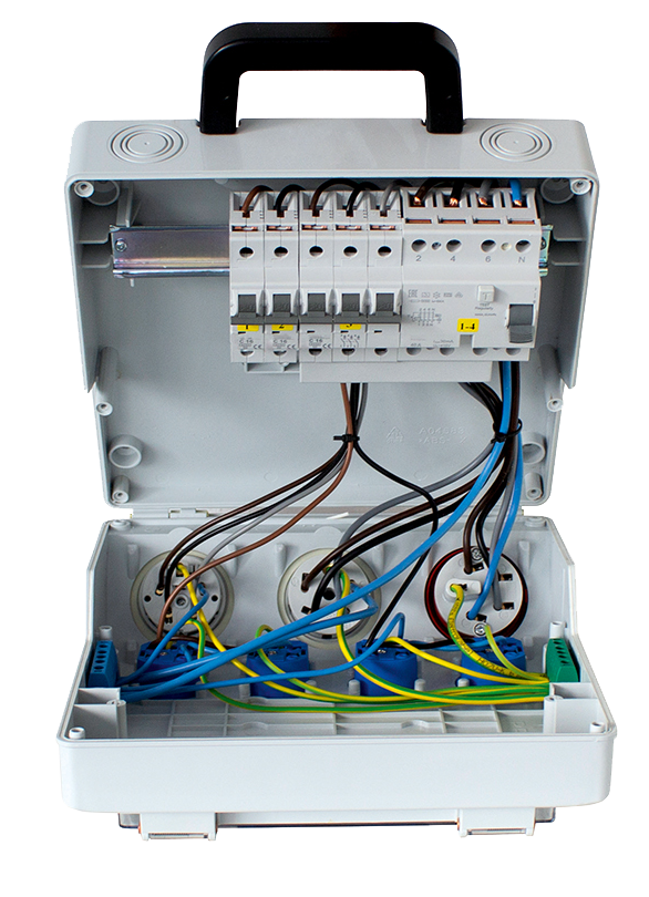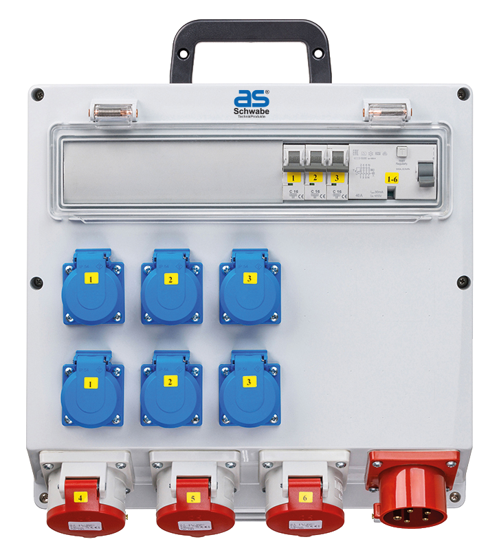 • 6x geaarde contactdoos 230 V, 16 A (over fasen verdeeld)