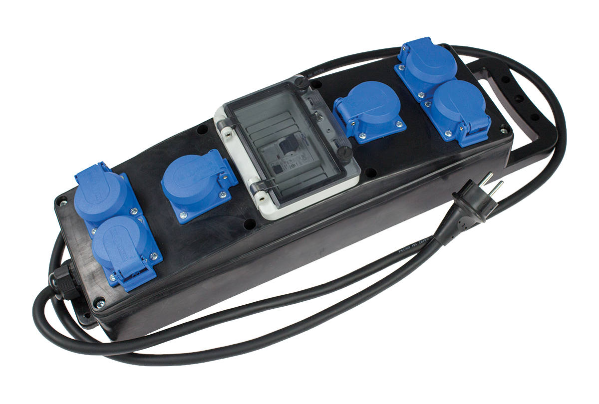 Verdeeldoos met behuizing van extreem robuust massief rubber en aardlekschakelaar