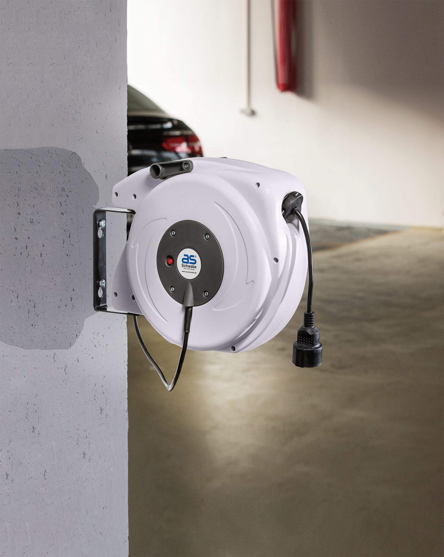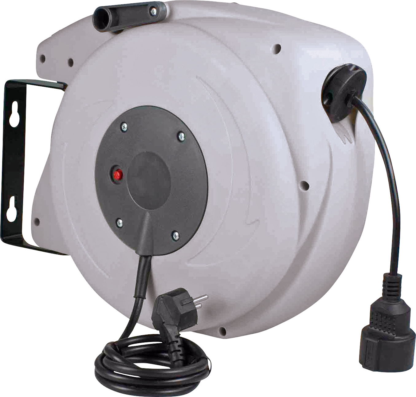 Licht trekken aan de kabel is voldoende en het automatische oprolmechanisme bergt de hele kabel op in de behuizing