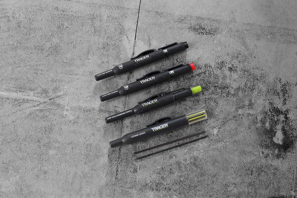 Dankzij de unieke 120 mm intrekbare, verwisselbare stiften kan het Tracer diepgat-potlood gemakkelijk door balken en balken heen markeren.