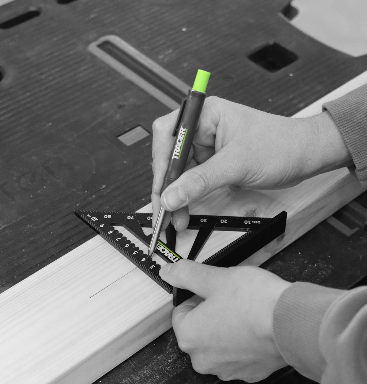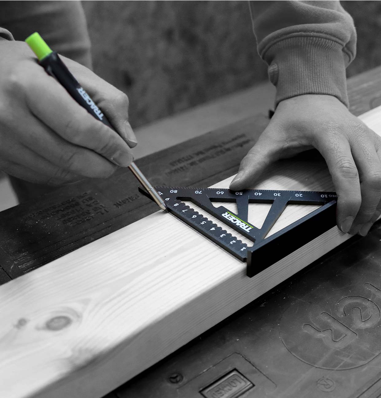 De TRACER Speed Square is een precisietimmergereedschap dat ideaal is voor het markeren van hout en spanten. Het is gemaakt van robuust aluminium en is uitgerust met twee linialen en hoekmarkeringsgeleiders.