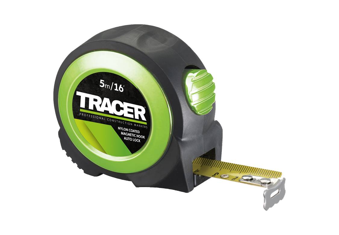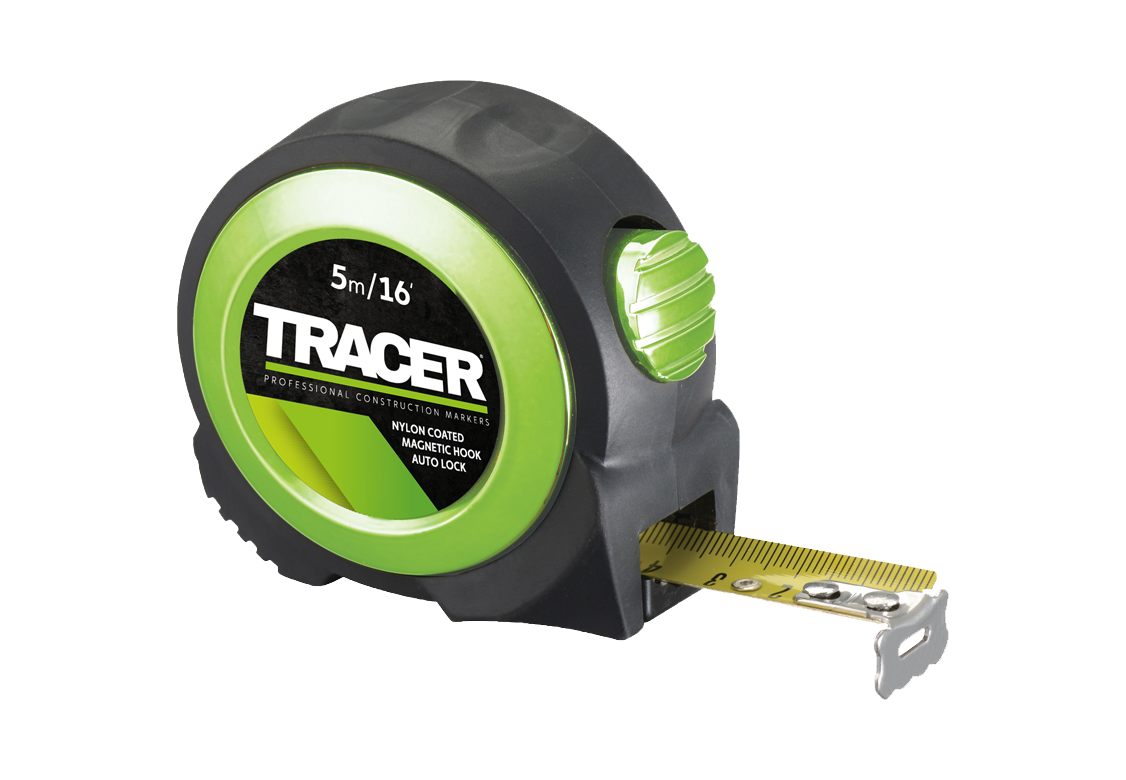 Het TRACER meetlint is een hoogwaardig meetinstrument, compleet met een automatische vergrendelingsfunctie en magnetische haak.