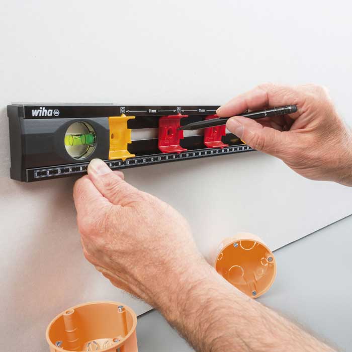 Met de waterpas kan, dankzij de doorlopende kunststof behuizing, lijnen worden afgetekend zonder onderbrekingen. Zelfs in bovenaanzicht kan met de geraffineerd geplaatste schaalverdelingen comfortabel worden bemaat. Nog een voordeel bij de elektrotechnische installatie bieden de variabele afstandsmarkeringen voor maximaal 4 inbouwdozen. Dankzij de verschuifbare markeerpunten voor inbouwdozen kan de waterpas aan de betreffende nationaal voorgeschreven markeringsafstanden worden aangepast en dus ook internationaal worden gebruikt. Dankzij zijn compacte vorm is hij bovendien perfect geschikt voor mobiel gebruik en kan hij gemakkelijk in de Wiha elektricienskoffer worden opgeborgen.