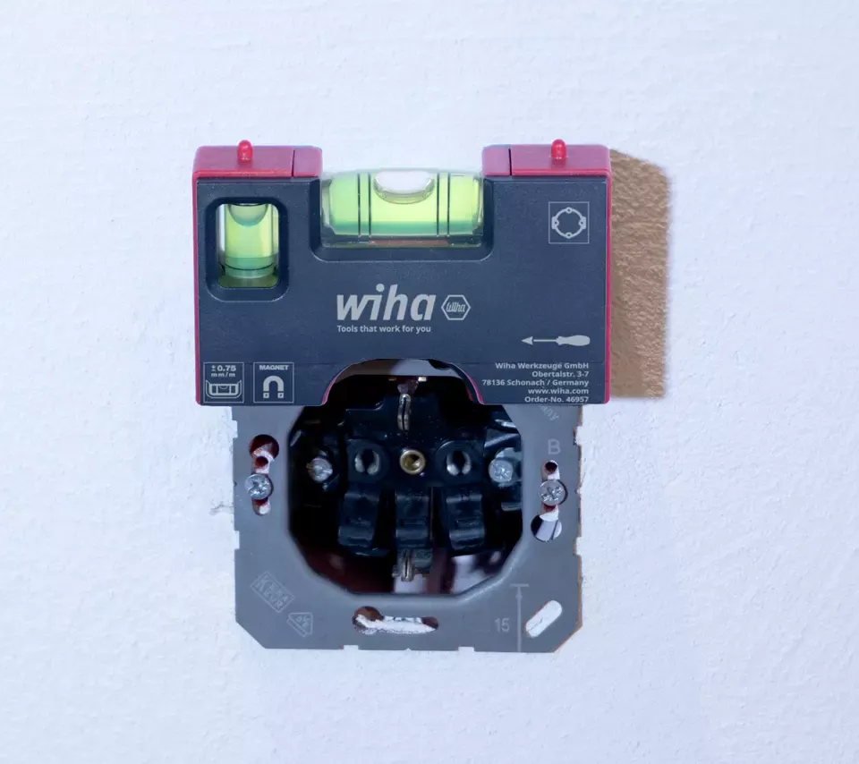 De Wiha Pocket mini-waterpas is een compacte en slimme tool voor het nauwkeurig monteren van wandcontactdozen. Je kunt er zowel horizontaal als verticaal perfect mee uitlijnen, en zelfs een lichte afschot van 2% instellen. Dankzij handige centreerpunten past hij precies op inbouwdozen, terwijl een kerf helpt bij hollewanddozen. Magneten zorgen ervoor dat hij stevig op metalen onderdelen blijft zitten.