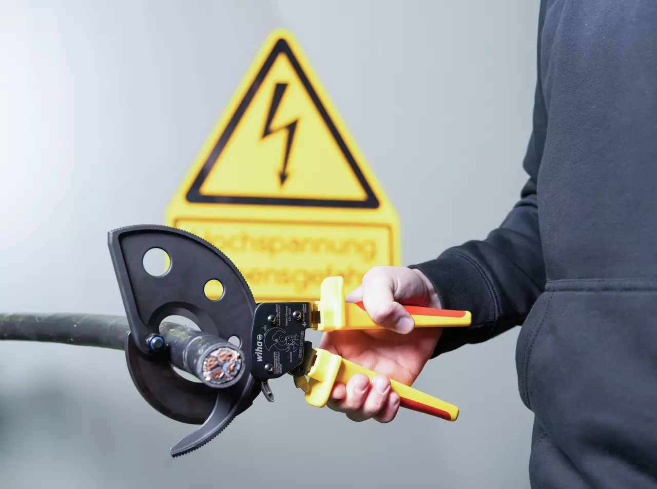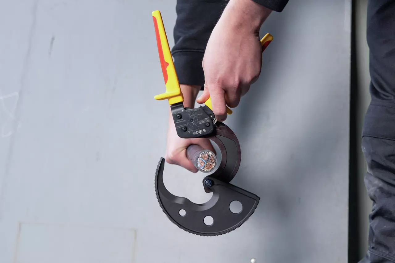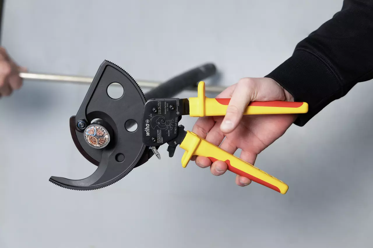 De ratelkabelknipper van Wiha kan worden gebruikt om eenvoudig koperen of aluminium kabels (geleidingsklasse 2) op lengte te knippen.